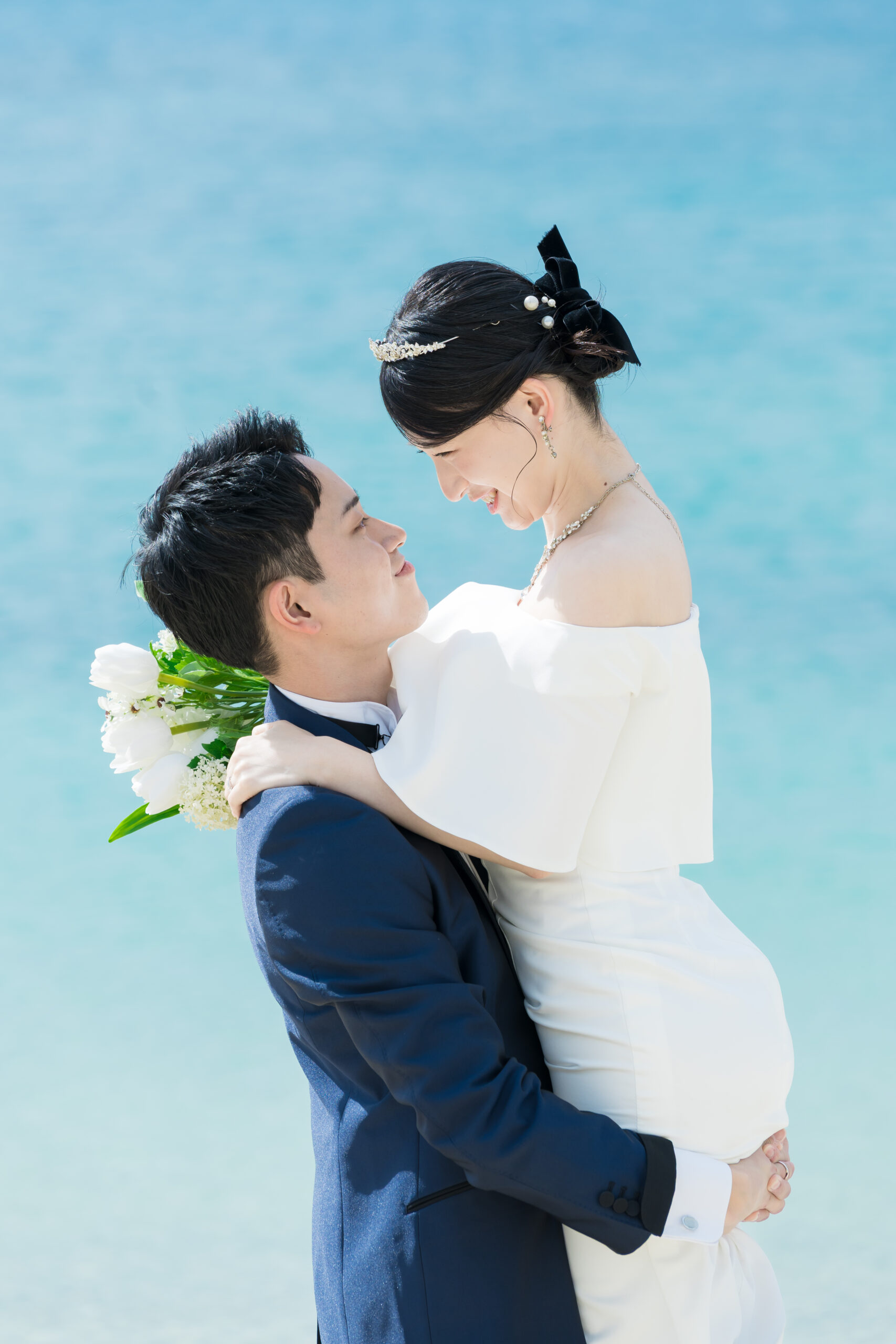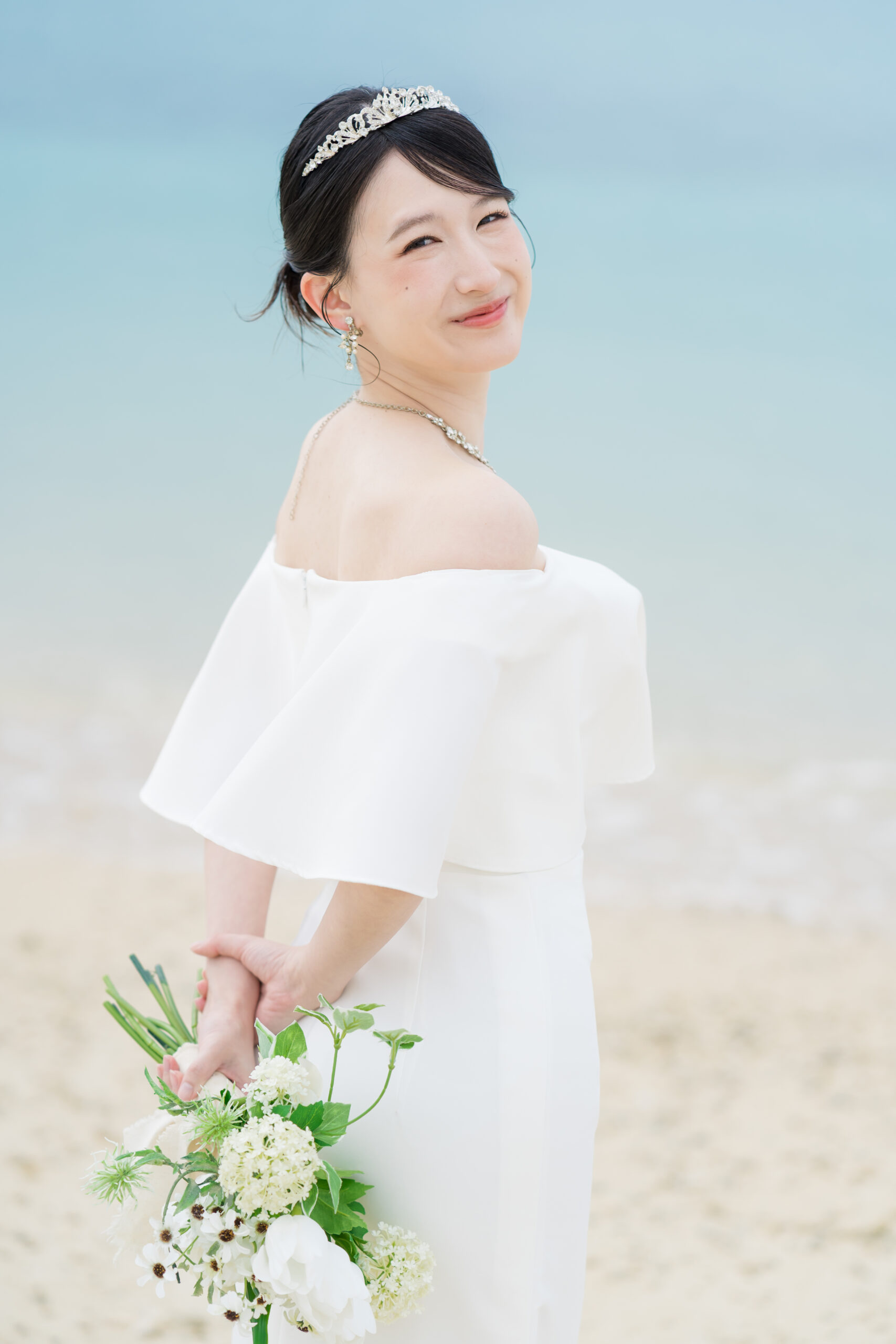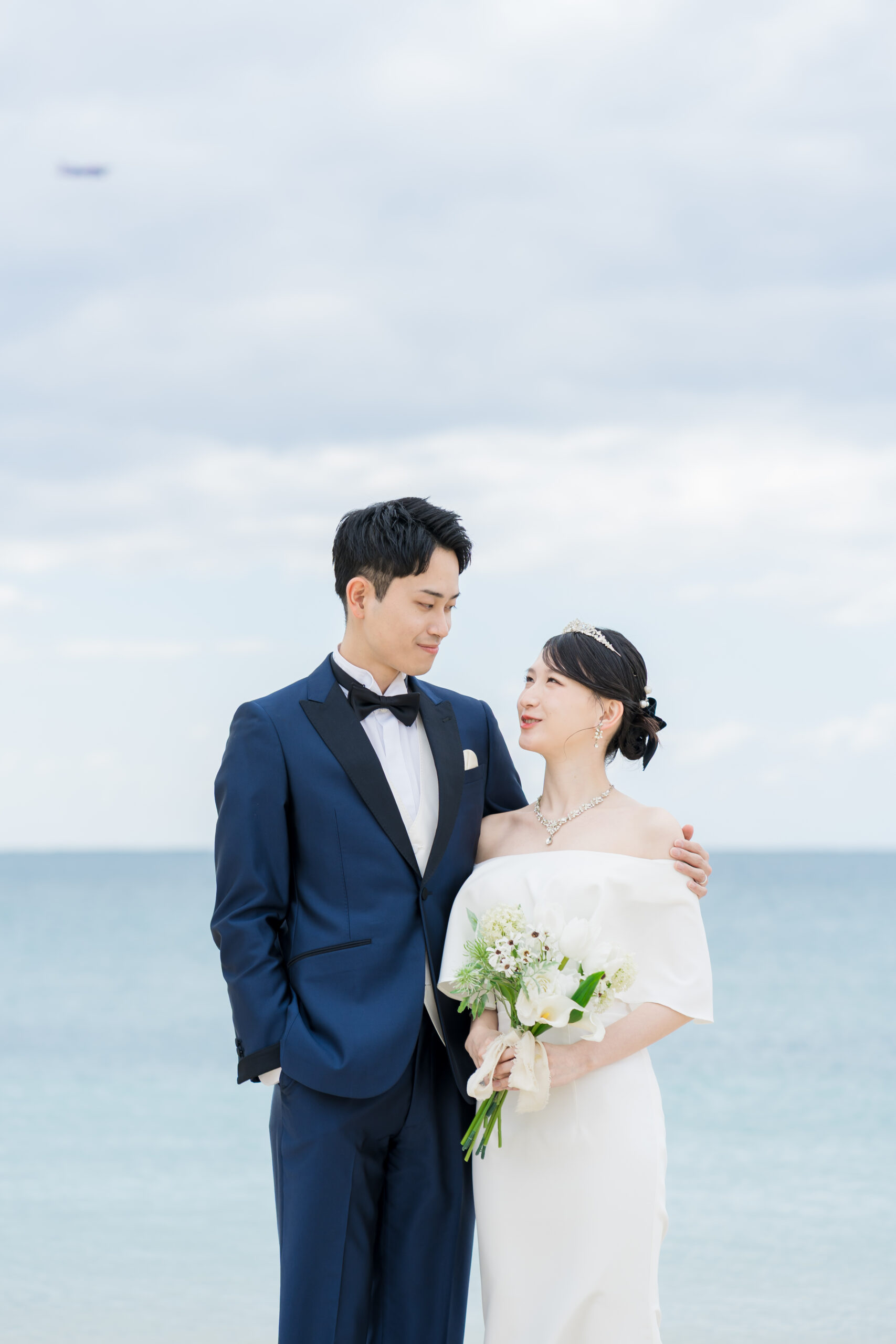 シーンを変えてビーチへ。青い海と空、やわらかな光に包まれながら、手を取り合って歩く姿を撮影しました。 波音を聞きながら交わす視線や、ふとした笑い声までが自然体のまま写り込み、飾らない美しさが際立ちます。 ドラマチックでありながら気取らない、沖縄らしい心地よさが広がる時間になりました。