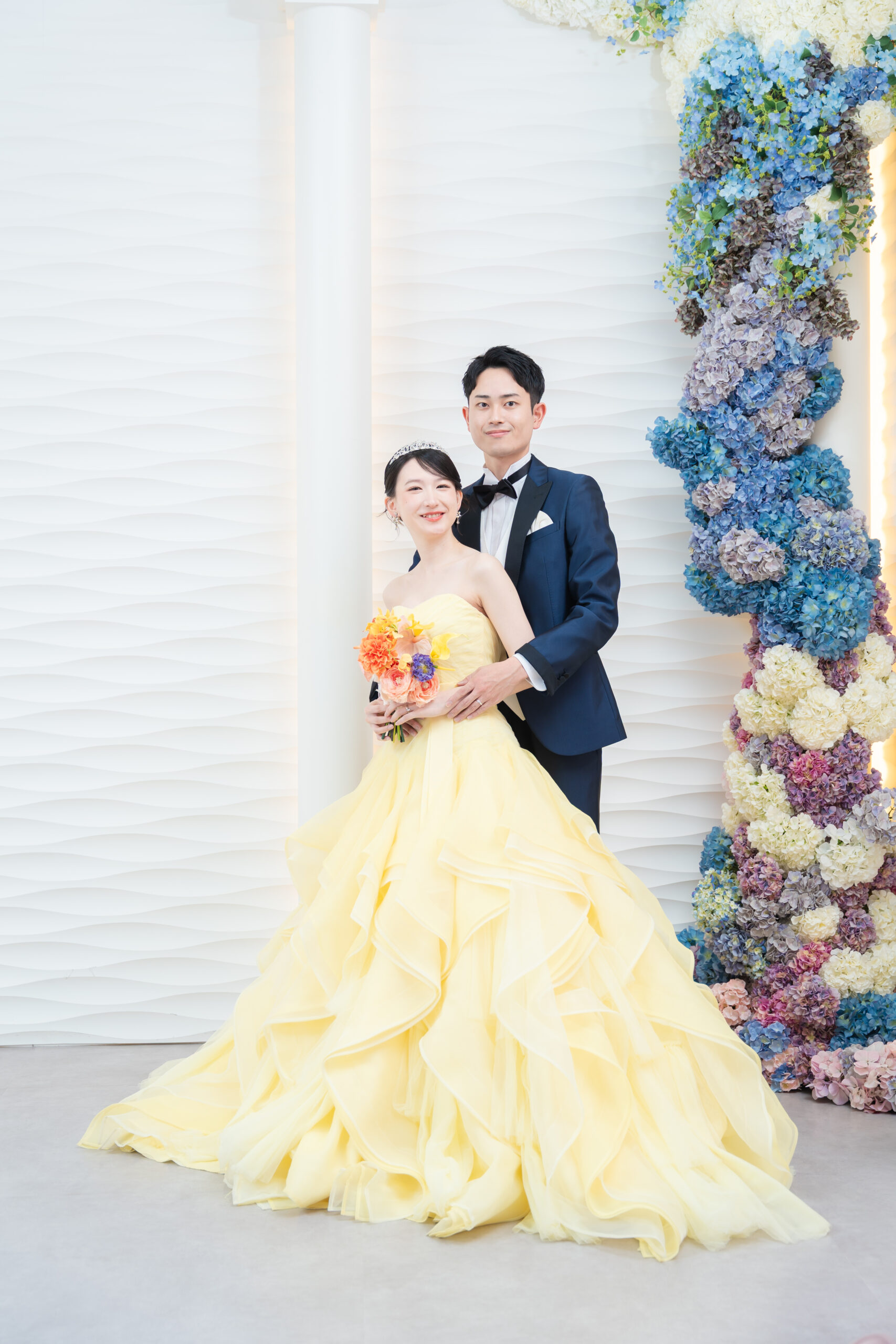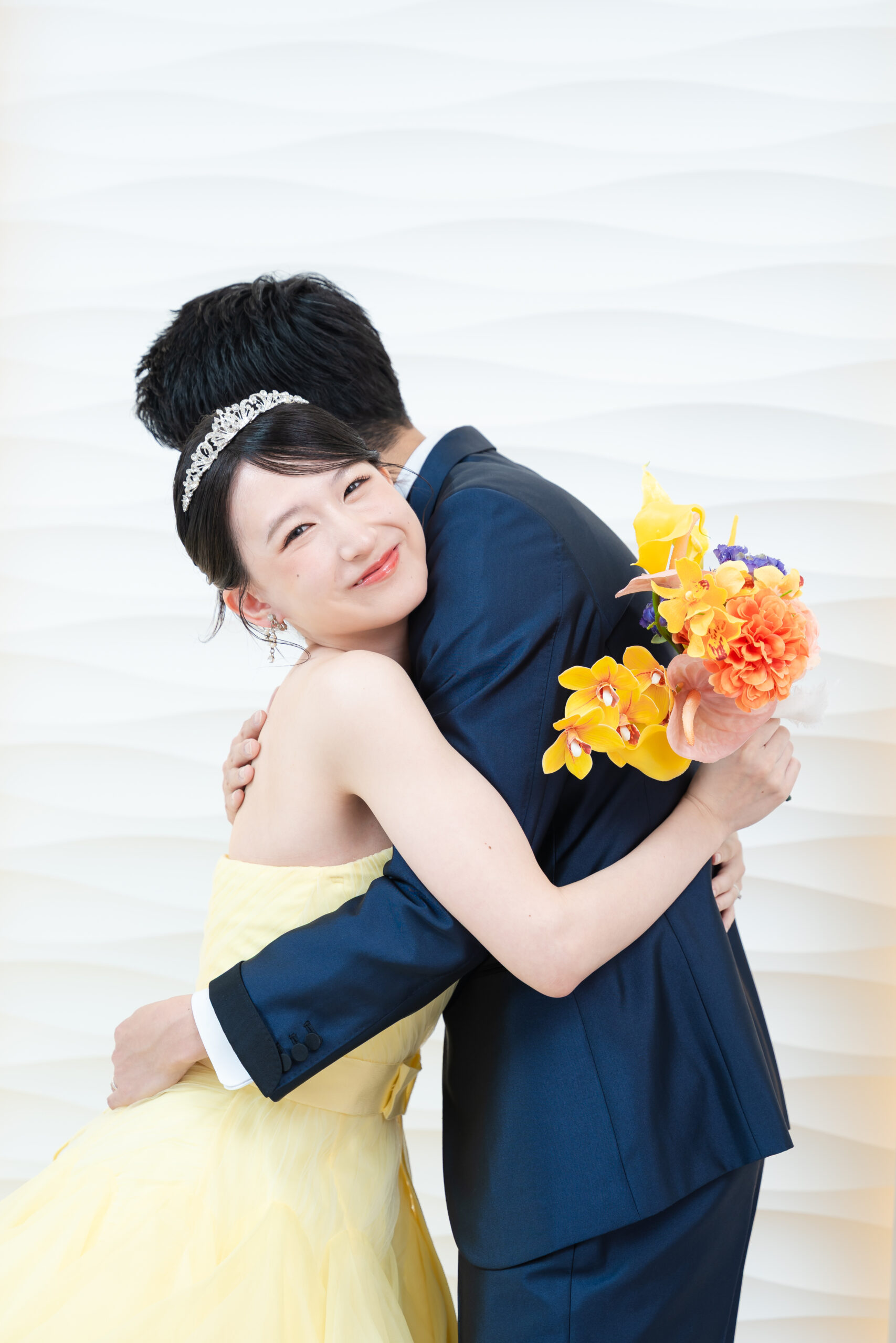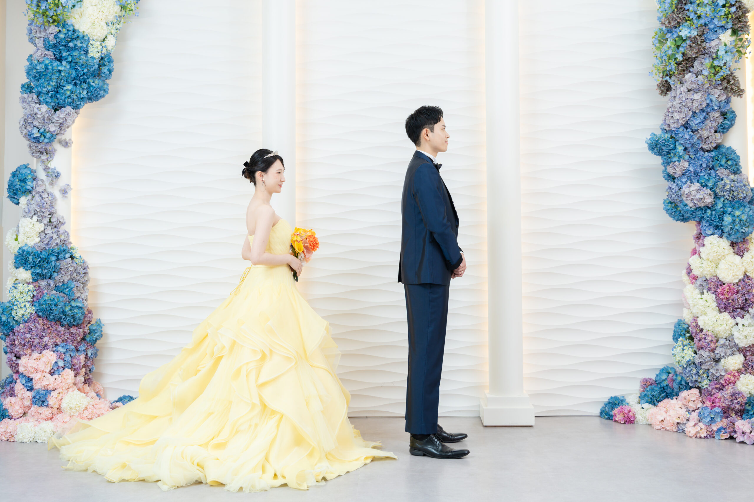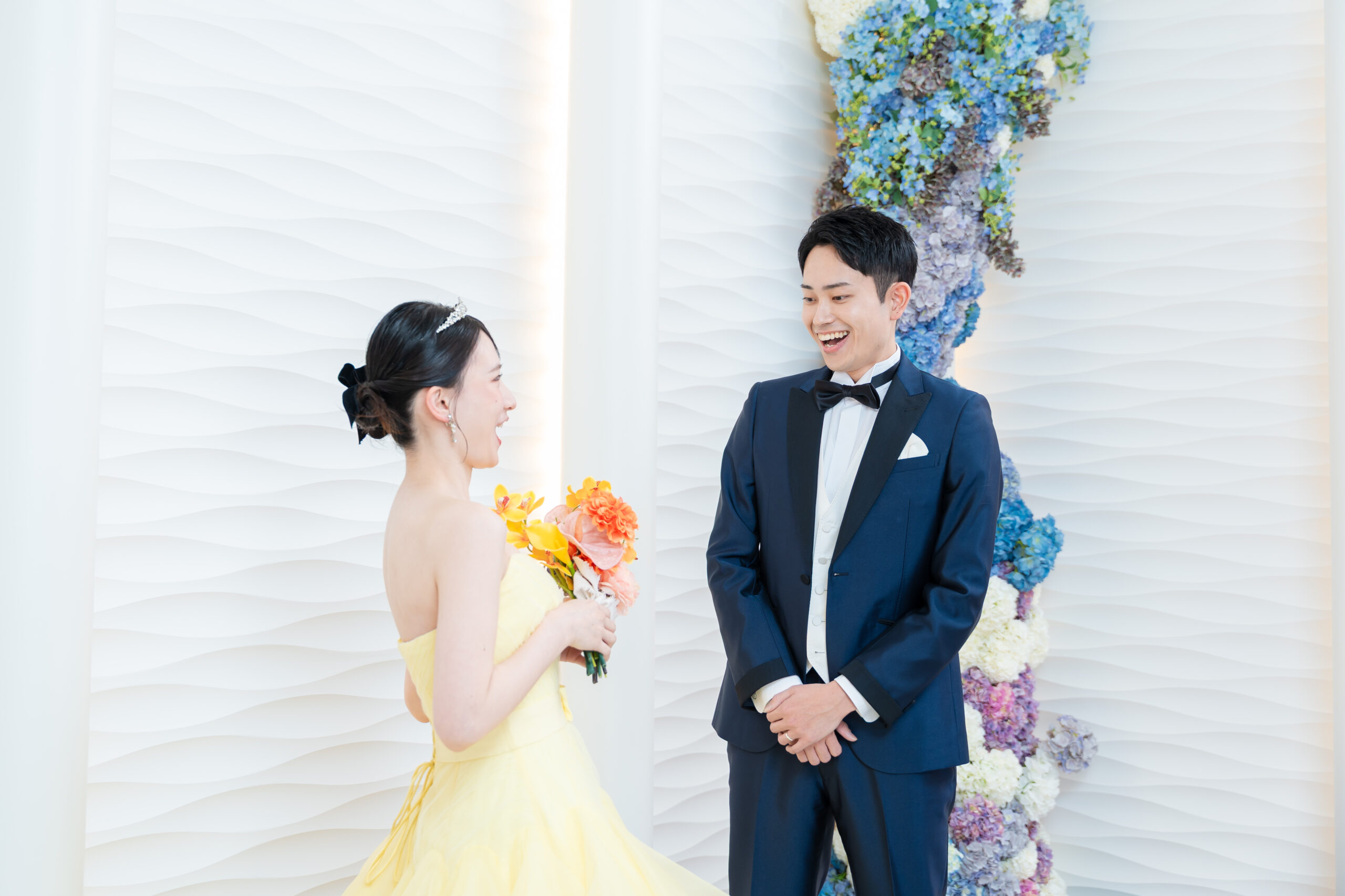 撮影はスタジオでのファーストミートからスタート。背中を向けて待つ新郎さまのもとへ、新婦さまがそっと歩み寄ります。 声をかける前の静かな時間には、言葉以上の想いが満ちていて、その空気感だけでも胸が温かくなるほど。 振り返った瞬間、新郎さまが思わず涙ぐむお姿に、そばで見守っていたスタッフも胸が熱くなりました。 初対面の緊張がやさしい笑顔に変わっていく、その流れごと丁寧に写真へ残していきます。