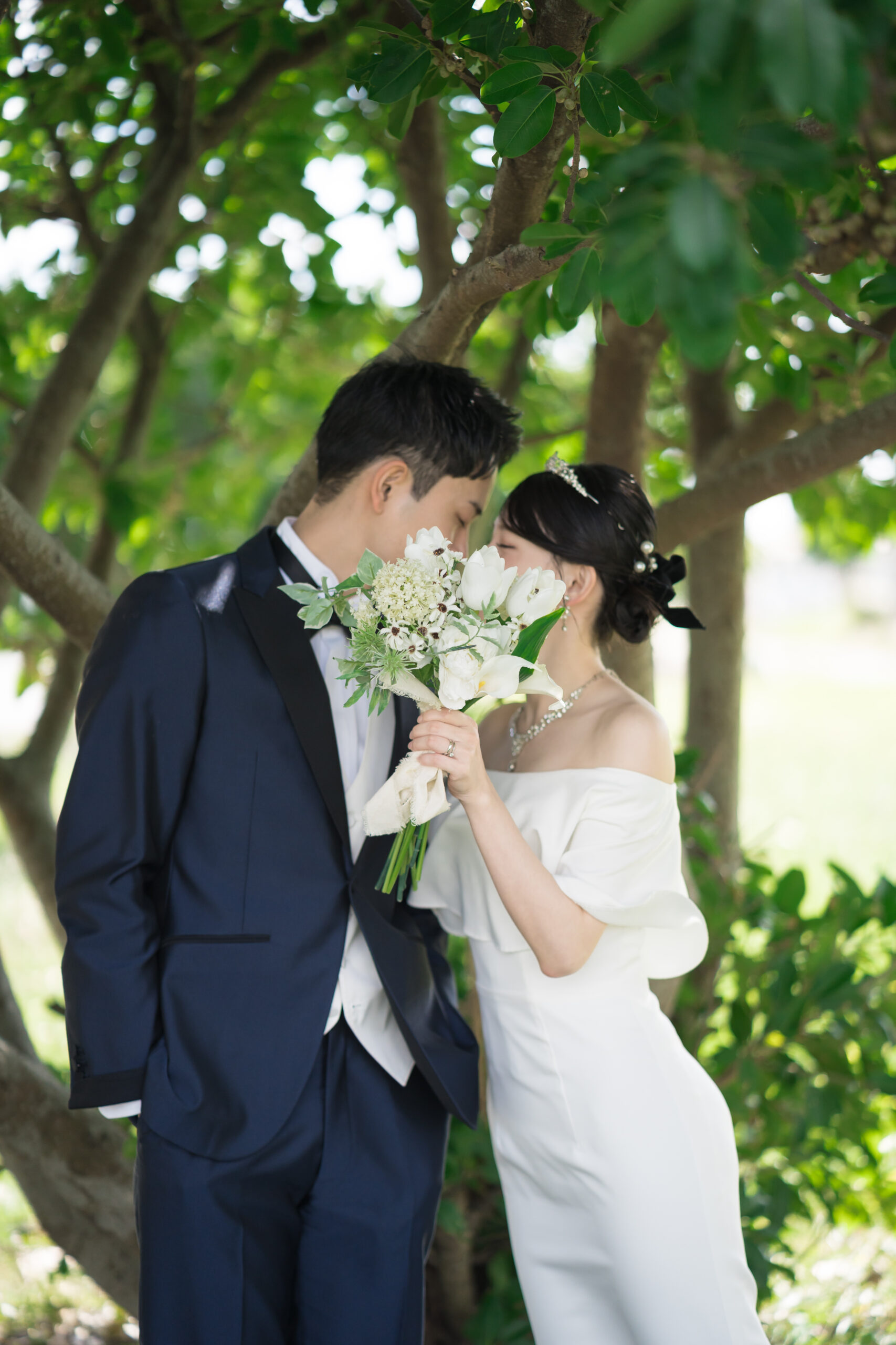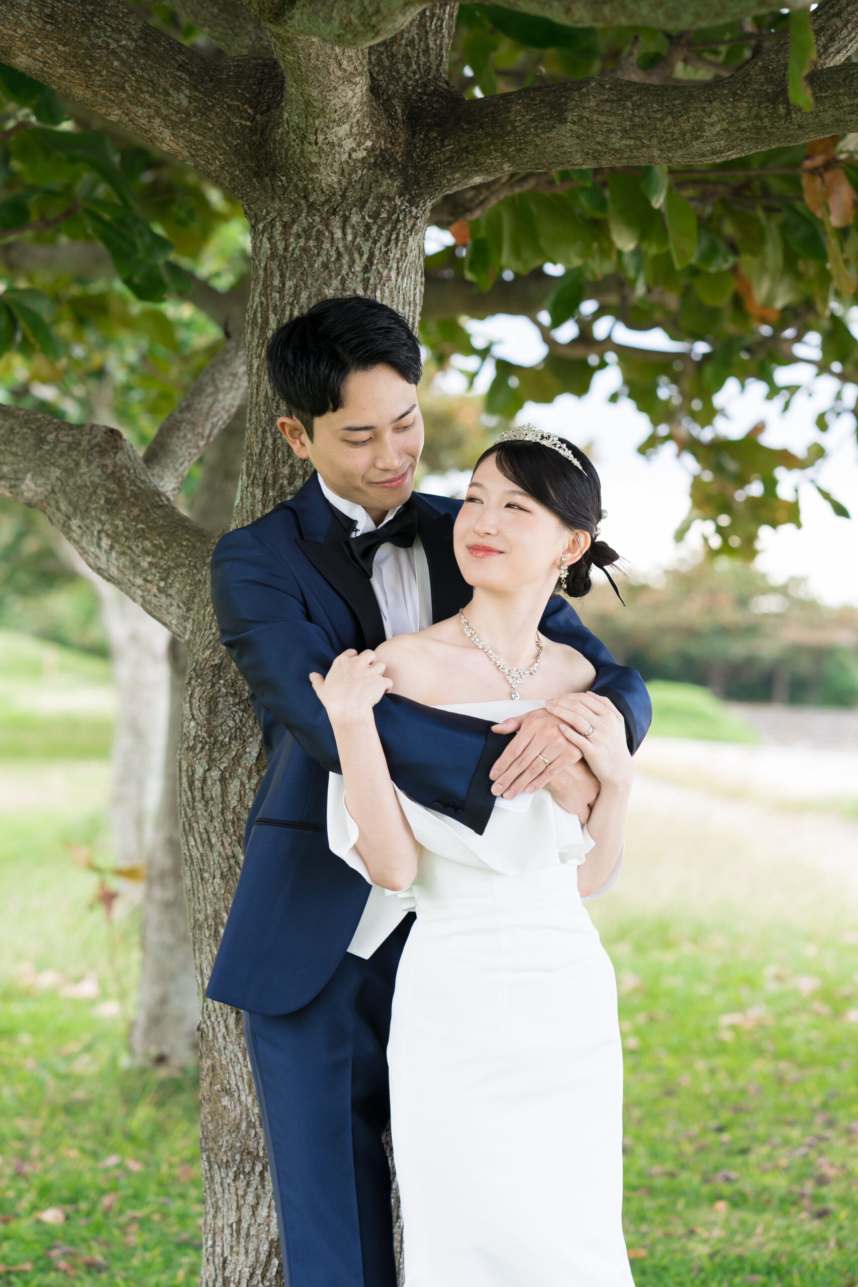 最後はグリーンの中で、木漏れ日のやさしさを感じながら撮影。肩の力が抜けた表情や、そっと寄り添う仕草が印象的でした。 ファーストミートで始まった一日の余韻が、穏やかな空気感として残り、写真にもやさしく映り込みます。 見返すたびに、初めて目を合わせたあの瞬間の気持ちまで思い出せる——そんなウェディングフォトになりました。