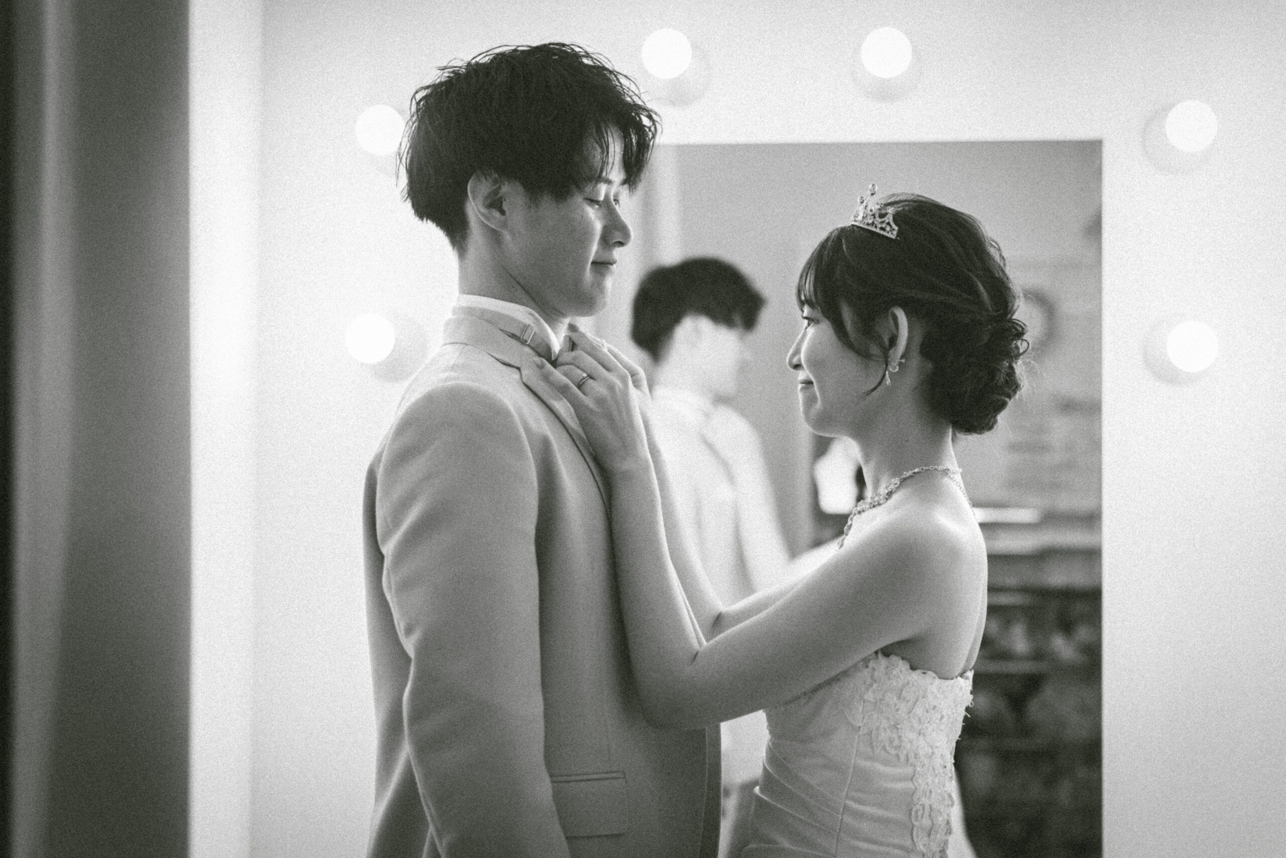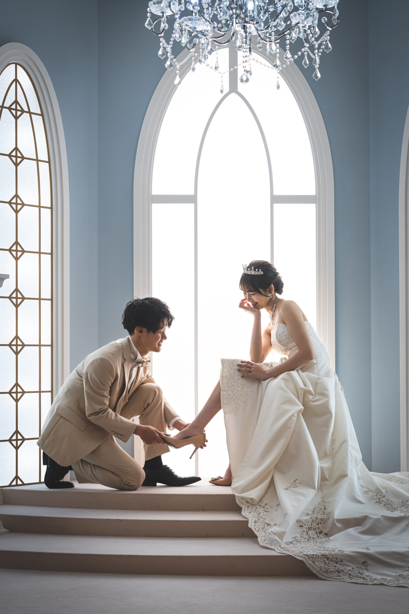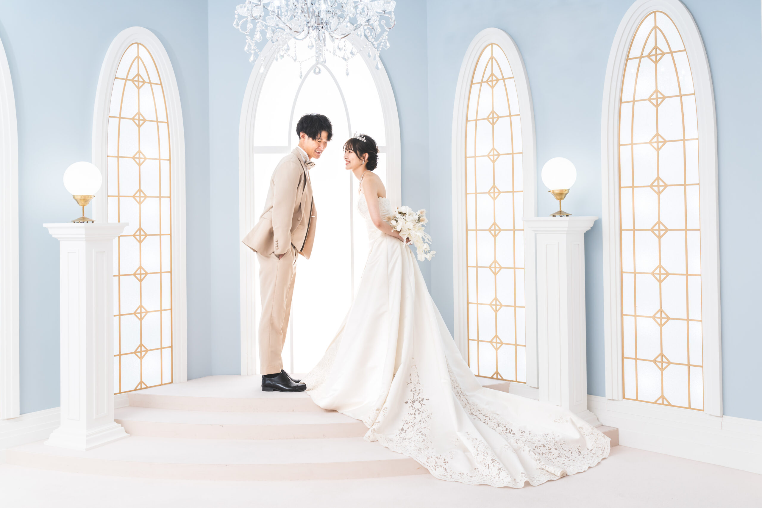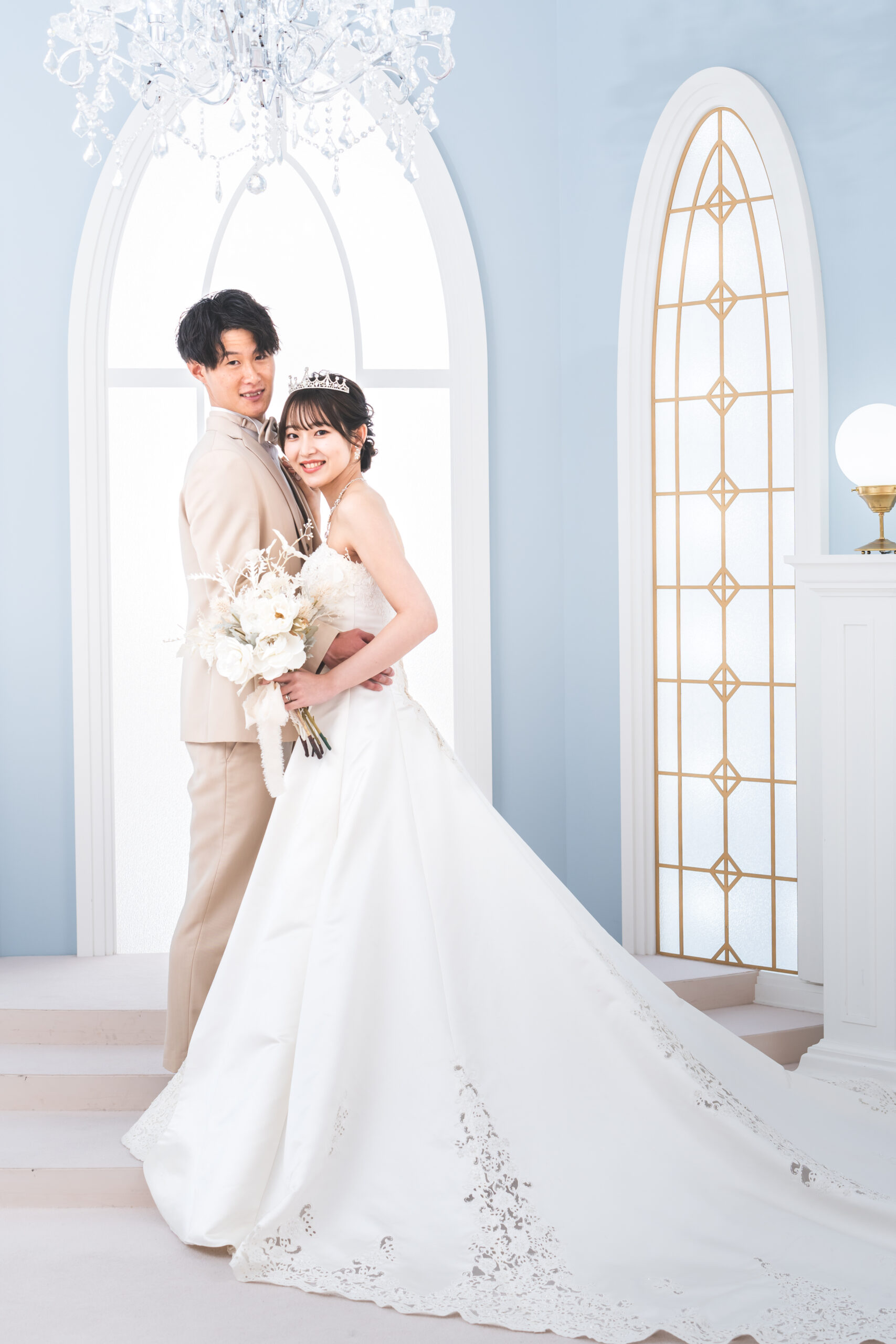 最後はブルーを基調としたチャペル風背景で、清らかで洗練された雰囲気に。 柔らかな光に包まれながら向き合うおふたりの姿は、 これから始まる新しい人生を静かに感じさせる、印象的な一枚に仕上がりました。