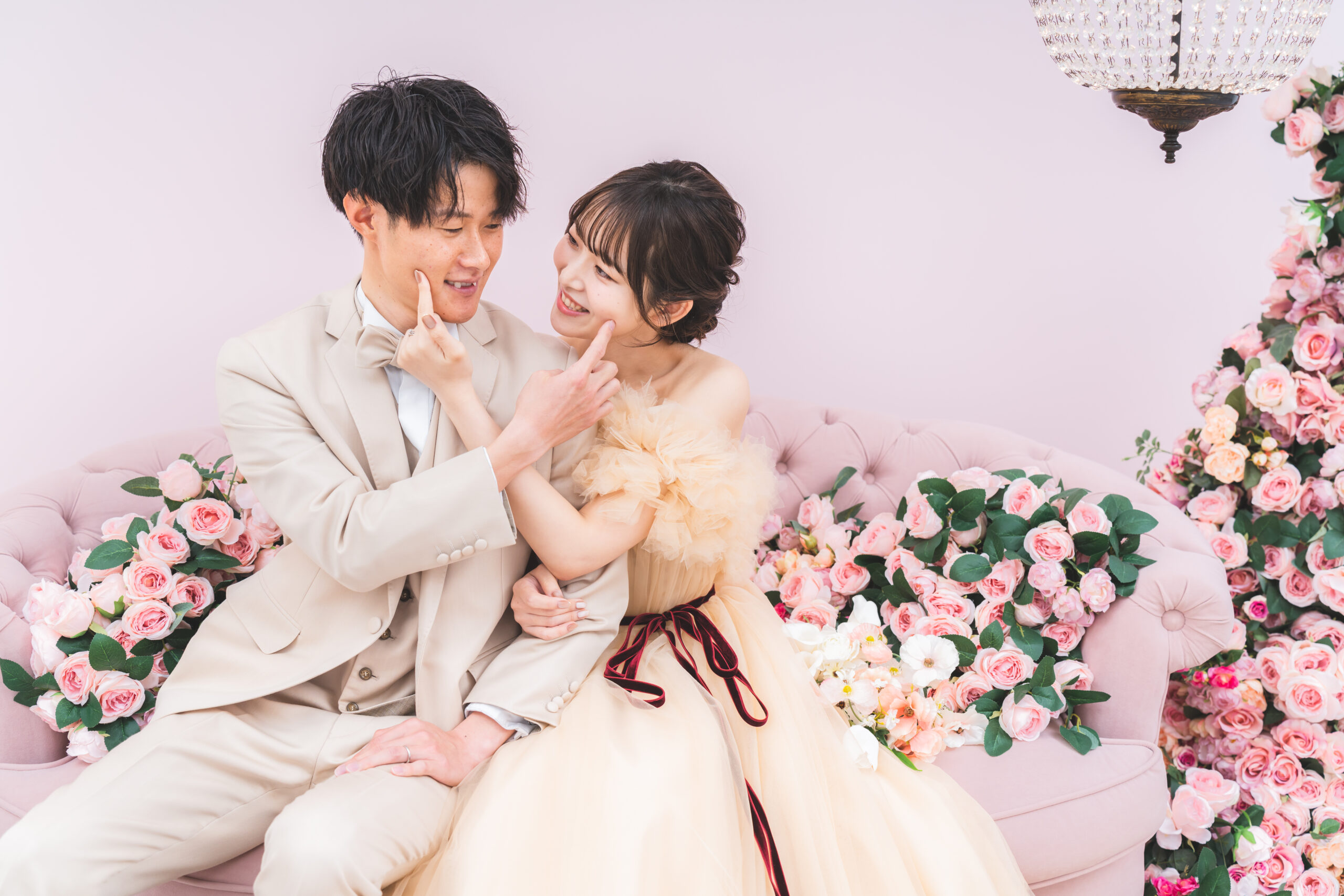 スタジオ内のローズ&ピンクを基調とした背景では、 柔らかな色合いに包まれた、可憐で上品な雰囲気の撮影を。 ドレスのチュールやブーケの色味がより引き立ち、 写真全体にやさしい華やかさを添えてくれます。